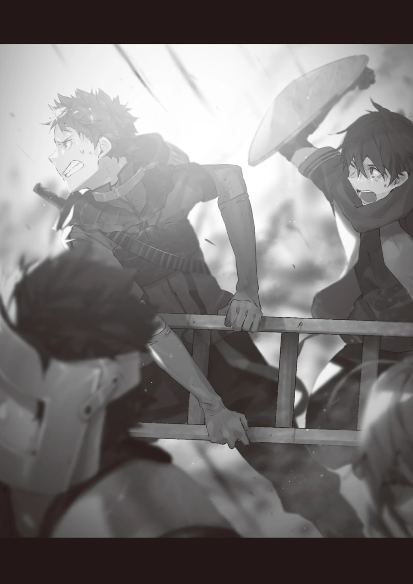 With a little struggle, Haruhiro's and Choco's party are able to place the ladders unto the walls. The main force fails to breach the front gate and leaves the reservists on their own. Despite the power of team Renji, Haruhiro's and Choco's teams are forced into a melee with Haruhiro ordering his party members to protect Choco's party. They are able to charge inside the keep with the help of Kajiko's force who had broken through on the other side. Exhausted, the volunteer soldiers are spurred to life with the promise of 100 gold for Zoran Zeshuu, an orc warlord, and 50 gold for Abael, an orc sorcerer. Kajiko's Wild Angels split off while Team Renji rushes up the watchtower with a couple parties following after them. Haruhiro contemplates waiting on the first floor where it's safe but decides to go up, leaving Choco's team with the others who decided not to go for the bounty.